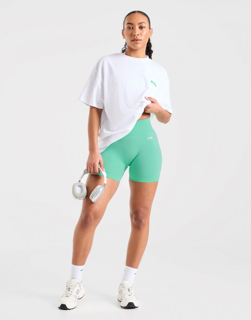 Ob beim Training oder zum Entspannen nach dem Workout – mit diesem Damen-Focus-T-Shirt von AYBL erfrischst du deine Garderobe. In Weiß mit grünen Akzenten ist dieses Oversize-T-Shirt aus weicher Baumwolle für langanhaltenden Tragekomfort gefertigt. Es hat einen gerippten Rundhalsausschnitt und kurze, weite Ärmel für bequemes Tragen. Das AYBL-Branding auf der Brust und ein Grafikprint auf dem Rücken runden das Design ab. Maschinenwaschbar. | Unser Model trägt Größe S.