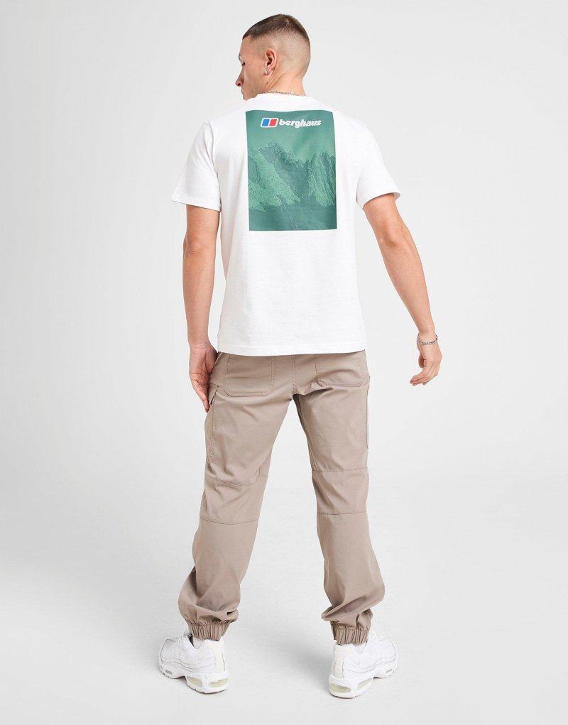 Mit diesem Herren-Kontrast-T-Shirt von Berghaus bist du top gestylt und zeigst dich auf der Straße. Das JD-exklusive T-Shirt in Weiß hat einen gerippten Rundhalsausschnitt und kurze Ärmel für einen klassischen Schnitt. Es besteht aus weichem, strukturiertem Baumwollstoff. Das Berghaus-Branding auf der Brust, das Logo auf dem Bündchen und eine auffällige grüne Berggrafik auf dem Rücken runden das Design ab. Maschinenwaschbar. | Unser Model ist 1,83 m groß, hat einen Brustumfang von 99 cm und trägt Größe M.