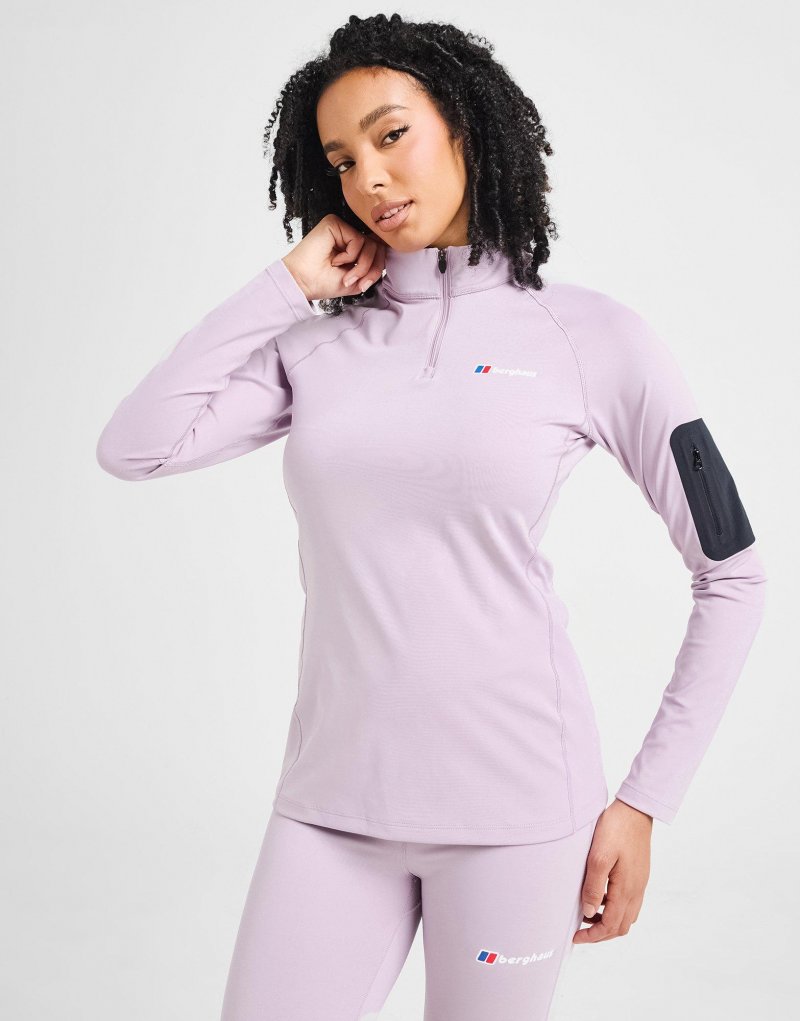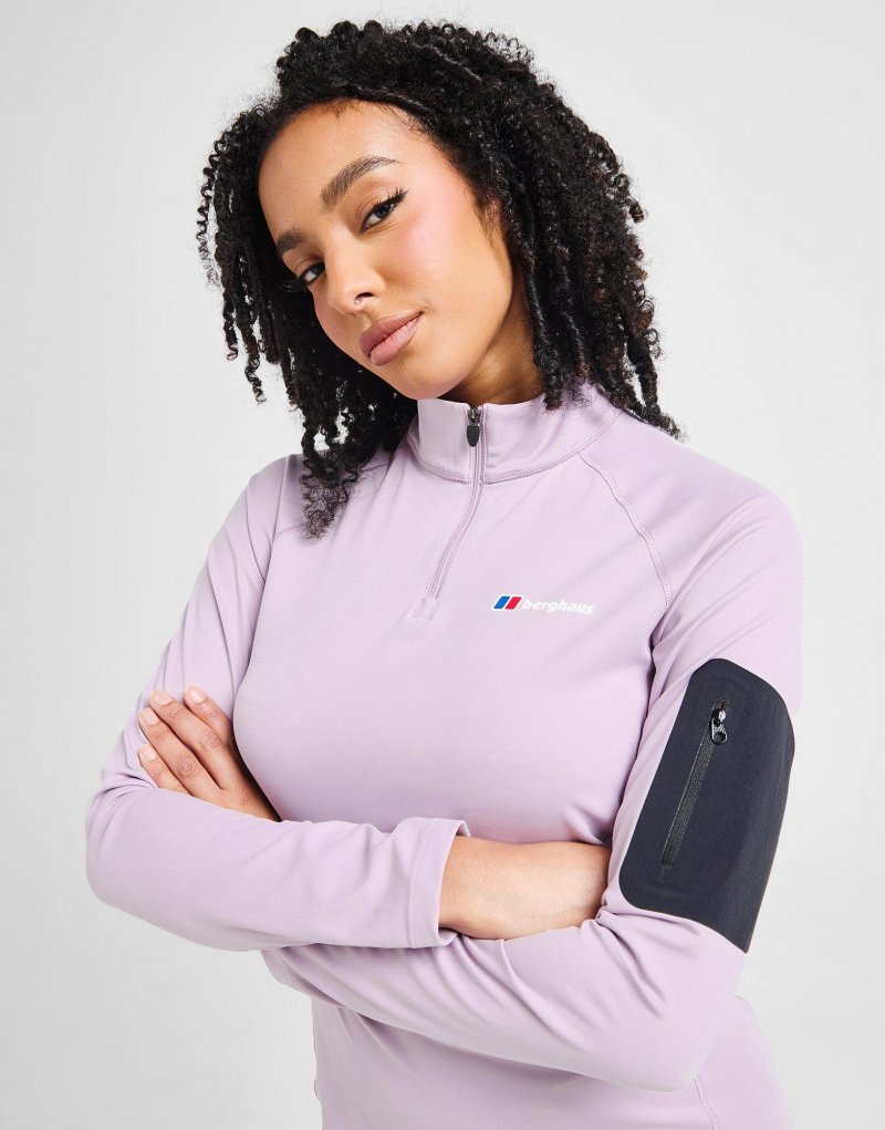 Mit diesem Woven Pocket 1/4 Zip Top für Damen von Berghaus bist du perfekt für dein Abenteuer gerüstet. Dieses JD-exklusive Top in Lila besteht aus einem glatten, dehnbaren Stoff für leichten Halt. Es verfügt über einen Viertelreißverschluss, einen Stehkragen sowie Raglanärmel und eine Reißverschlusstasche am linken Arm. Abgerundet wird das Design durch den Berghaus-Branding-Print auf der Brust. Maschinenwaschbar. | Unser Model ist 1,73 m groß und trägt Größe 8.