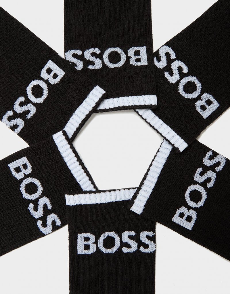 Geben Sie Ihrem Premium-Look den letzten Schliff mit diesem 6er-Pack Crew-Socken für Herren von BOSS. Diese Socken in der Farbe Schwarz bestehen aus einem dehnbaren Baumwollmischgewebe und haben ein geripptes Design für absoluten Komfort und eine sichere Passform. Sie sind mit verstärkten Details an Ferse und Zehen für mehr Halt ausgestattet und mit kontrastierendem BOSS-Branding und einem gestreiften Bündchen versehen. Maschinenwaschbar.