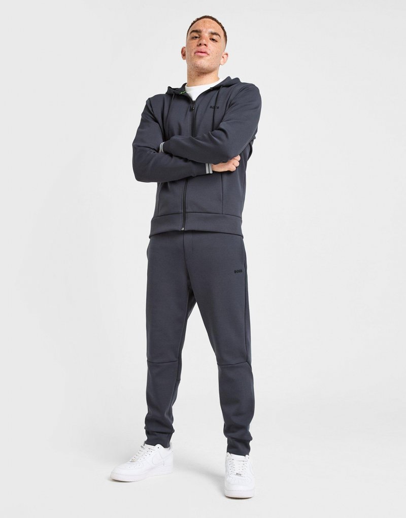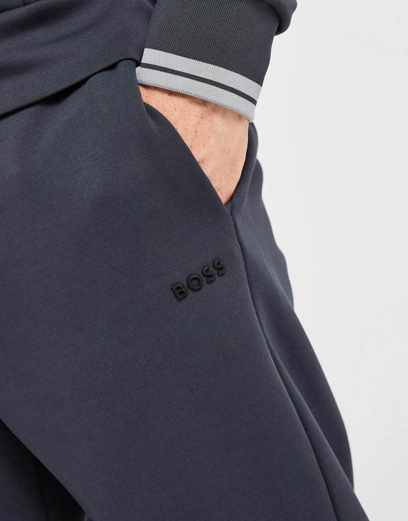 Mit der BOSS Hadiko Zone Jogginghose für Herren bringst du Premium-Style in deinen Freizeit-Look. Diese Hose ist in der Farbe Navy gehalten und besteht aus einer glatten, leichten Stretch-Baumwollmischung für erstklassigen Komfort. Darüber hinaus verfügt sie über einen elastischen Bund mit Kordelzug für einen sicheren Halt, während gerippte Bündchen am Beinende die Passform stabilisieren. Die Seiten- und Gesäßtaschen bieten Platz für deine Utensilien und das kontrastierende Logo von BOSS befindet sich am Oberschenkel. Waschmaschinengeeignet. Unser Model ist 1,83 m groß und trägt Größe M.