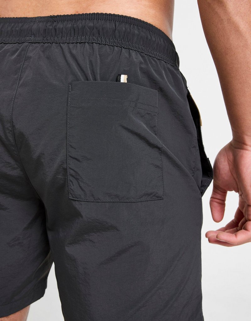 Mit den Louis Badeshorts für Herren von BOSS bist du perfekt für den Strand. Die Shorts in Schwarz mit Blockstreifen in der typischen Markenkombination haben einen verstellbaren Kordelzugbund, seitliche Eingrifftaschen und eine aufgesetzte Gesäßtasche. Sie bestehen aus schnelltrocknendem Gewebe und sind mit dem BOSS-Schriftzug versehen. Maschinenwaschbar. | Unser Model trägt Größe M.