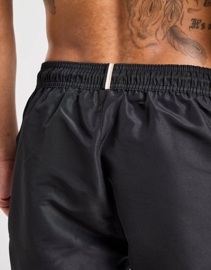 Mit diesen Repeat Tape Badeshorts für Herren von BOSS sind Sie am Pool auf der sicheren Seite. Diese schwarzen JD-exklusiven Shorts sind aus leichtem, schnelltrocknendem Gewebe gefertigt, das Sie kühl hält. Sie verfügen über einen elastischen Bund mit Kordelzug, um sie an Ort und Stelle zu halten. Sie verfügen über offene Eingrifftaschen für Ihre wichtigsten Utensilien, sind mit einem aufgeklebten BOSS-Branding an den Seiten, gestreiften Details auf der Rückseite und dem Wortzeichen auf dem linken Oberschenkel versehen. Maschinenwaschbar. | Unser Model ist 1,85 m groß und trägt Größe M.