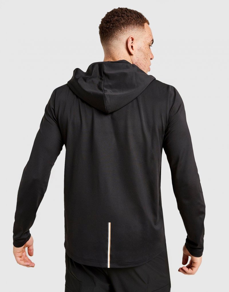 Bringen Sie Premium-Vibes in Ihr Training mit diesem Scott Active Overhead Hoodie für Herren von BOSS. Der Hoodie in Schwarz ist aus glattem, leichtem Recycling-Polyester gefertigt und sorgt für langanhaltenden Tragekomfort. Er hat lange Ärmel und eine Kapuze für zusätzlichen Schutz. Er ist mit einem dreifarbigen Streifen auf dem Rücken und dem BOSS-Logo auf der Brust versehen. Maschinenwaschbar. | Unser Model ist 1,83 m groß, hat einen Brustumfang von 96 cm und trägt Größe M.