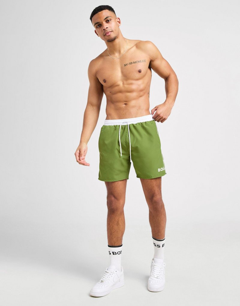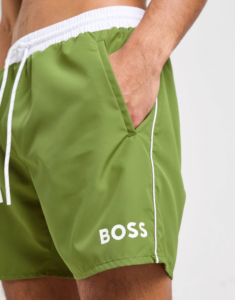 Mit diesen Starfish-Badeshorts für Herren von BOSS fallen Sie auf, wenn die Sonne scheint. Diese Strandshorts in Grün mit sportlicher weißer Paspelierung bestehen aus schnelltrocknendem recyceltem Polyester und haben ein atmungsaktives Polyesterfutter, das Sie kühl hält. Sie sind mittellang geschnitten und verfügen außerdem über einen Kordelzug am elastischen Bund, eine aufgesetzte Tasche auf der Rückseite und offene Eingrifftaschen an den Seiten. Abgerundet durch das BOSS-Logo auf dem linken Bein. Maschinenwaschbar. | Unser Model ist 1,85 m groß und trägt Größe M.