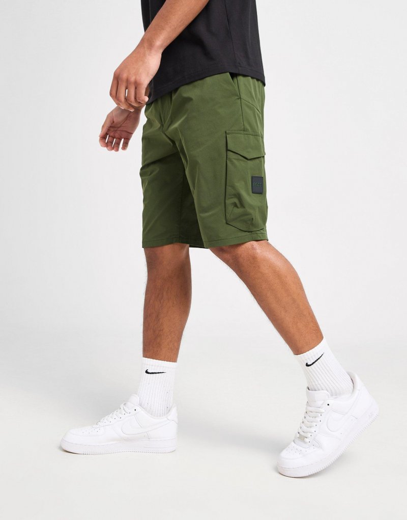 Bring Utility-Style in deinen Look mit der Urbanex Cargo Herren-Shorts von BOSS. Diese Shorts bestehen aus weichem, dehnbarem Popeline-Stoff und sind in der Farbe Khaki gehalten. Sie trocknen schnell und bieten ein bügelleichtes Finish. Außerdem verfügen sie über ein Seitennaht, einen Kordelzug und einen Reißverschluss am elastischen Bund für eine verstellbare Passform, während die Cargo-Pattentaschen Platz für deine Sachen sicherstellen. Abgerundet wird das Design durch das klassische BOSS-Logo auf der linken Tasche. Waschmaschinengeeignet. Unser Model trägt Größe M.