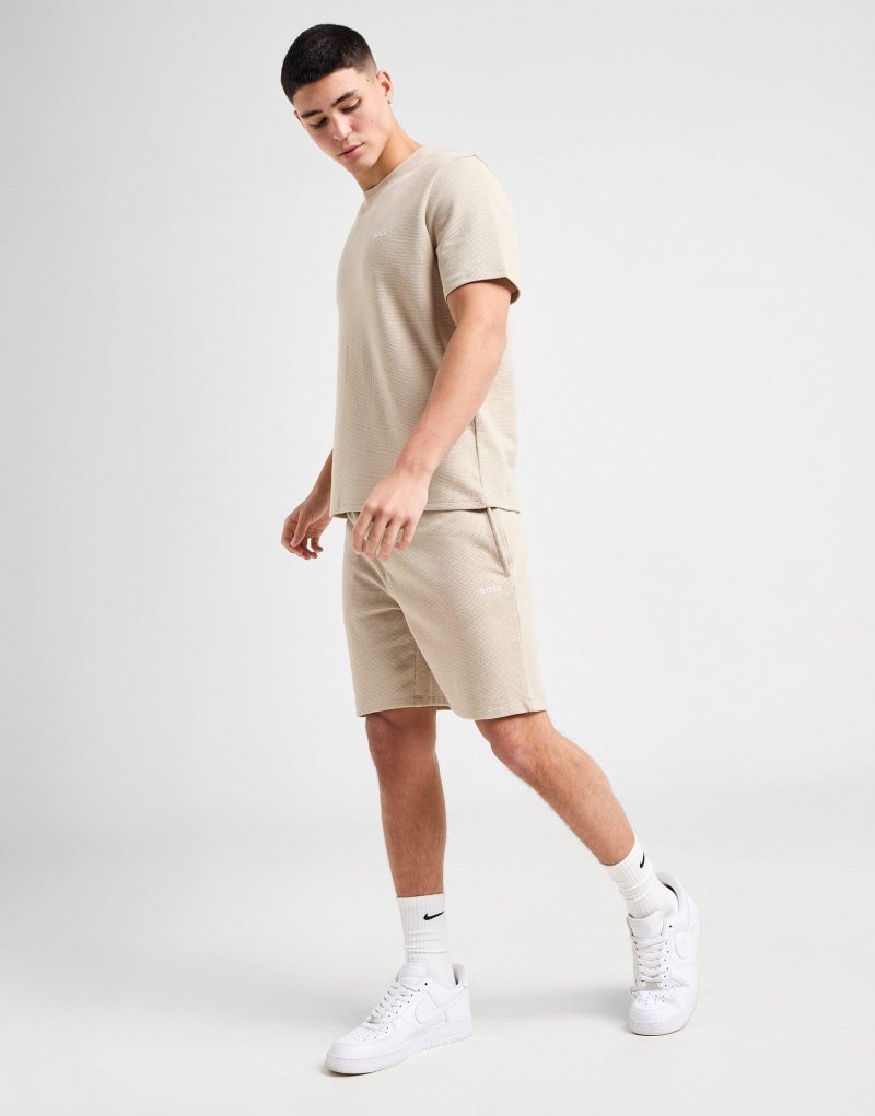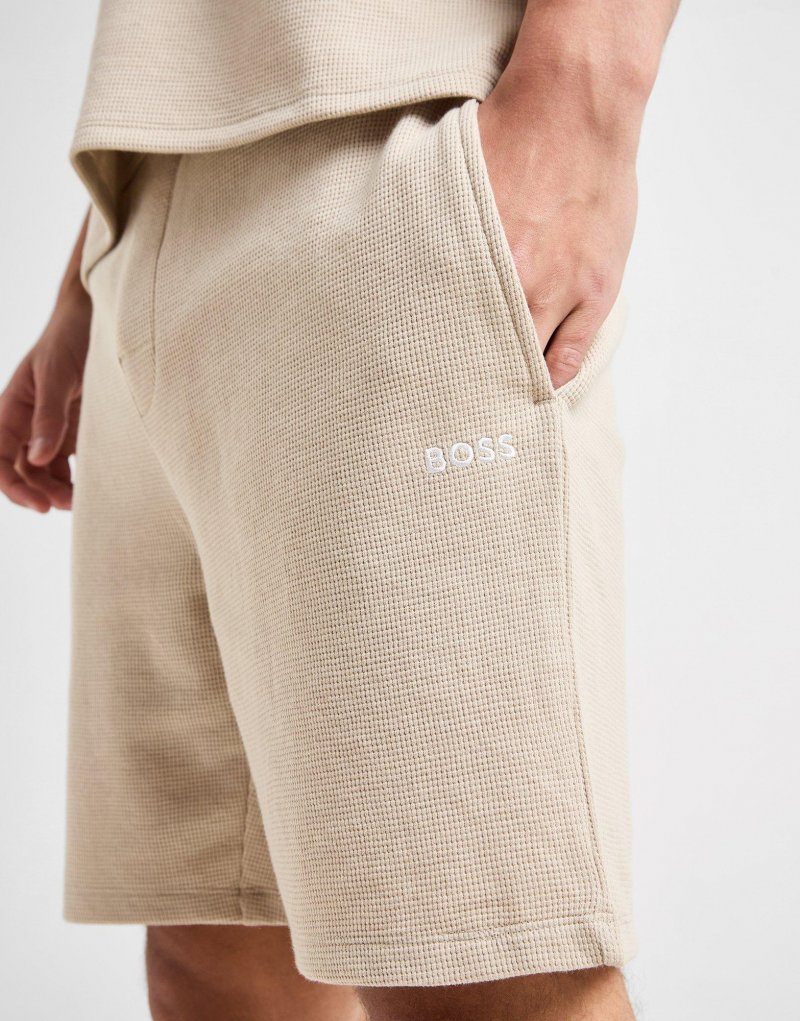 Verleihe deinem Look ein Premium-Upgrade mit den BOSS Waffle Shorts für Herren. Diese Shorts in der Farbe Stone bestehen aus glattem Baumwollmischgewebe mit Waffelstruktur, um absoluten Komfort sicherzustellen. Darüber hinaus verfügen sie über einen elastischen Bund mit Kordelzug, um die Passform sichern, während Seitentaschen Platz für deine Utensilien gewährleisten. Abgerundet wird das Ganze durch das legendäre Logo von BOSS auf dem Oberschenkel. Waschmaschinengeeignet. Unser Model trägt Größe M.