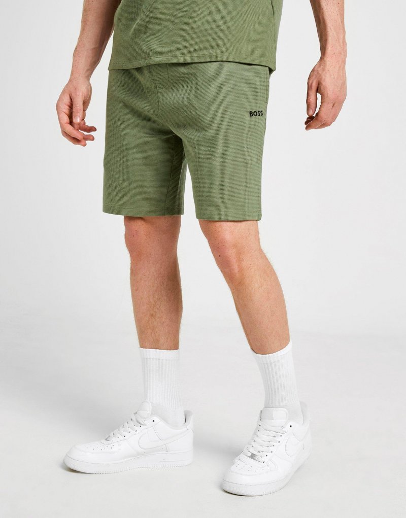 Verleihen Sie Ihren schlichten Looks mit diesen Herren-Waffle-Shorts von BOSS eine hochwertige Note. Die Shorts in Khaki-Farbgebung mit normaler Passform bestehen aus einem weichen Baumwoll-Waffle-Mischgewebe. Der elastische Bund mit Kordelzug sorgt für einen bequemen, alltagstauglichen Sitz, und die Seitentaschen bieten schnellen Stauraum. Abgerundet wird das Design durch den charakteristischen BOSS-Schriftzug am Oberschenkel. Maschinenwaschbar. | Unser Model ist 1,83 m groß, hat einen Brustumfang von 102 cm und trägt Größe M.