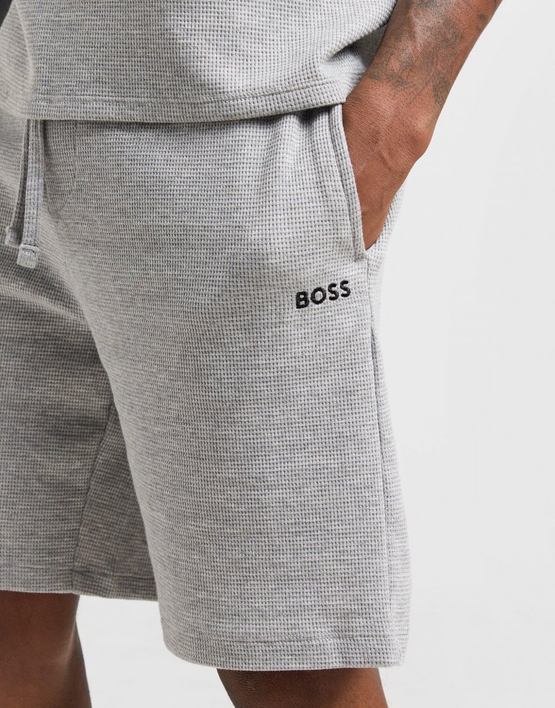 Frischen Sie Ihre Freizeitgarderobe mit diesen Waffle Shorts für Herren von BOSS auf. Diese Shorts in Grau sind aus einem weichen Baumwollmischgewebe mit Waffelstruktur für höchsten Tragekomfort gefertigt. Sie verfügen über einen elastischen Bund mit Kordelzug, sodass Sie die Passform anpassen können, und offene Seitentaschen, um wichtige Dinge zu verstauen. Abgerundet wird das Ganze durch ein gesticktes BOSS-Logo am Oberschenkel. Maschinenwaschbar. | Unser Model ist 1,83 m groß und trägt Größe M.