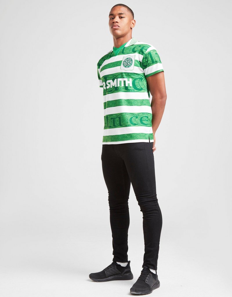 Upgrade deinen Fan-Look mit dem Celtic FC '96 Heim Herren-Shirt von Celtic Retro. Dieses Standard-Fit Oberteil ist in einem grün-weißen Streifendesign gehallten und mit einem farblich abgestimmtem All-Over-Print versehen. Es besteht aus leichtem Polyestergewebe und bietet maximalen Tragekomfort. Genau wie beim Profi-Trikot, verfügt es über einen Spreizkragen und kurze Ärmel für einen eleganten Look, während das ikonische Wappen des Celtic FC auf der Brust platziert ist. Waschmaschinengeeignet. Unser Model ist 1,83 m groß, hat einen Brustumfang von 107 cm und trägt Größe M.