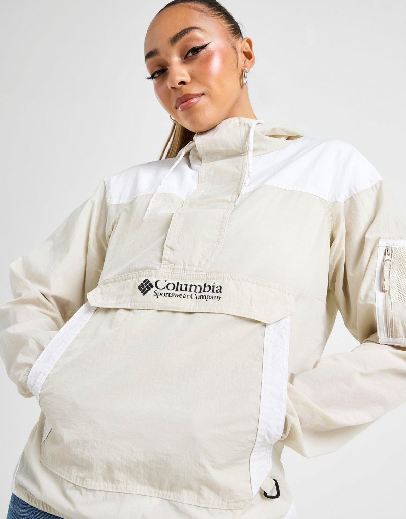 Retro trifft Moderne mit dieser leichten Challenger Jacke für Damen von Columbia. Im beige-weißen Farbblock-Design lässt sich diese JD-exklusive Jacke in der Handtasche verstauen und so bei Wetterumschwüngen platzsparend verstauen. An regnerischen Tagen weist die Omni-Shield-Technologie Feuchtigkeit ab und verhindert Flecken, während die verstellbare Kapuze und die elastischen Besätze für einen sicheren Sitz sorgen. Mit einer Kängurutasche und einer kleinen Ärmeltasche mit Reißverschluss trägt diese Jacke das übergroße Columbia-Logo auf der Vorderseite. Maschinenwaschbar. | Unser Model ist 1,73 m groß und trägt Größe S.