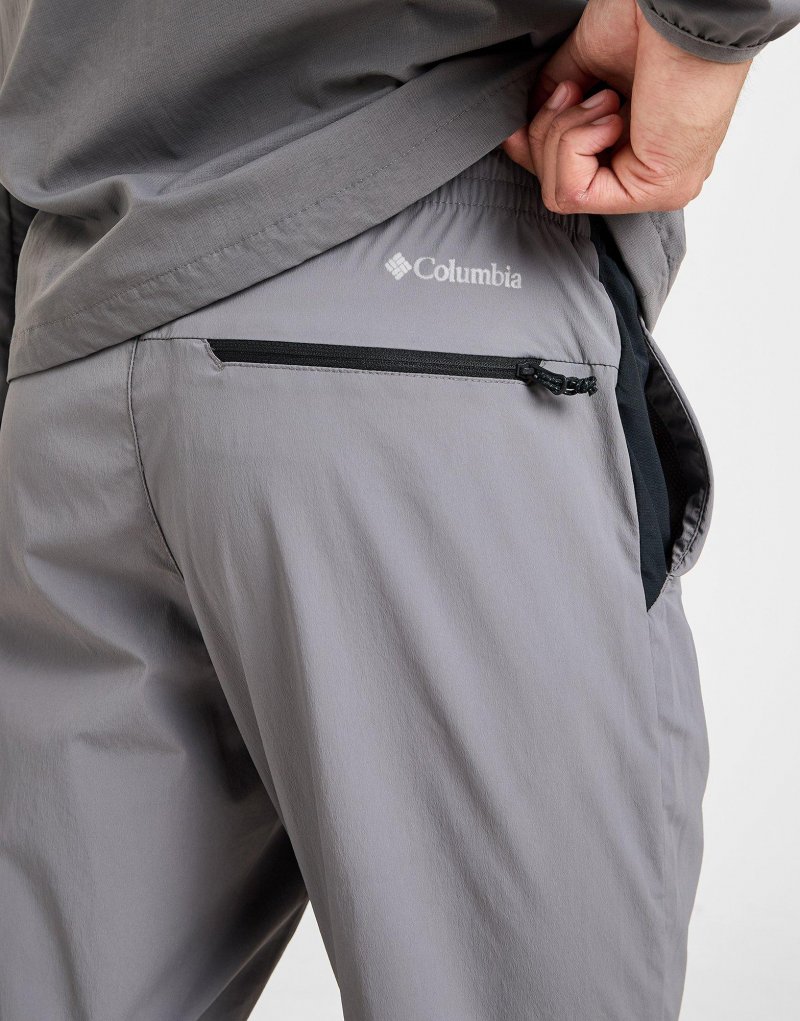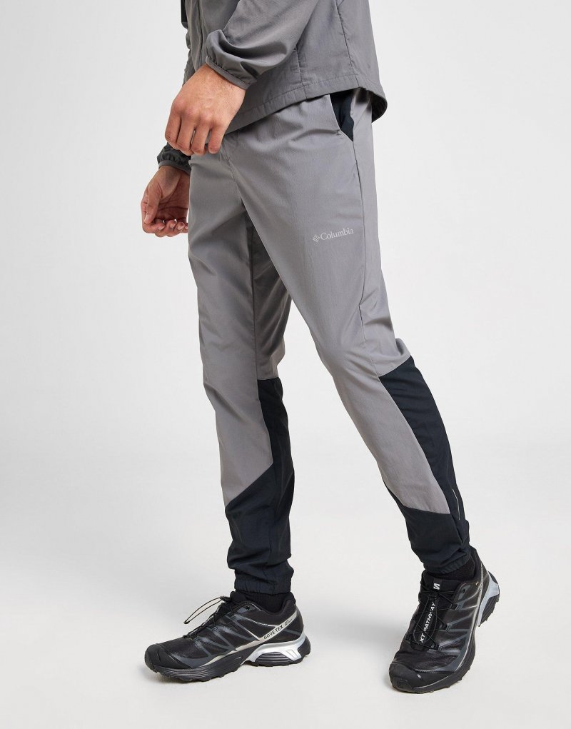 Gehen Sie mit diesen Tech Nylon Track Pants für Herren von Columbia raus. Diese Hose in einem Farbblockdesign in Grau und Schwarz besteht aus Stretchgewebe, das mit der Omni-Shield-Technologie von Columbia ausgestattet ist, die Sie vor Wind und Regen schützt. Sie verfügt über einen verstellbaren Kordelzugbund für eine sichere Passform sowie Seitentaschen für Ihre wichtigsten Dinge. Abgerundet durch reflektierende Details und das charakteristische Columbia-Branding. Maschinenwaschbar. | Unser Model ist 1,85 m groß und trägt Größe M.