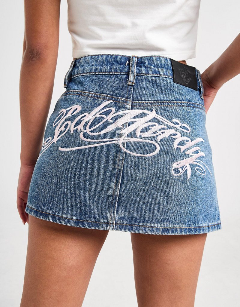 Upgrade deinen Sommer-Look mit dem Cross Denim Minirock von Ed Hardy. Dieser Slim-Fit Rock in Blau ist aus strapazierfähigem Baumwoll-Denim gefertigt und sorgt für dauerhaften Tragekomfort. Er verfügt über einen mittelhohen Bund mit Reiß- und Knopfverschluss, während das klassische 5-Taschen-Design Platz für deine Utensilien bietet. Ein aufgesticktes Logo von Ed Hardy verleiht dem Deisgn einen runden Abschluss. Waschmaschinengeeignet. Unser Model ist 1,70 m groß und trägt Größe S.