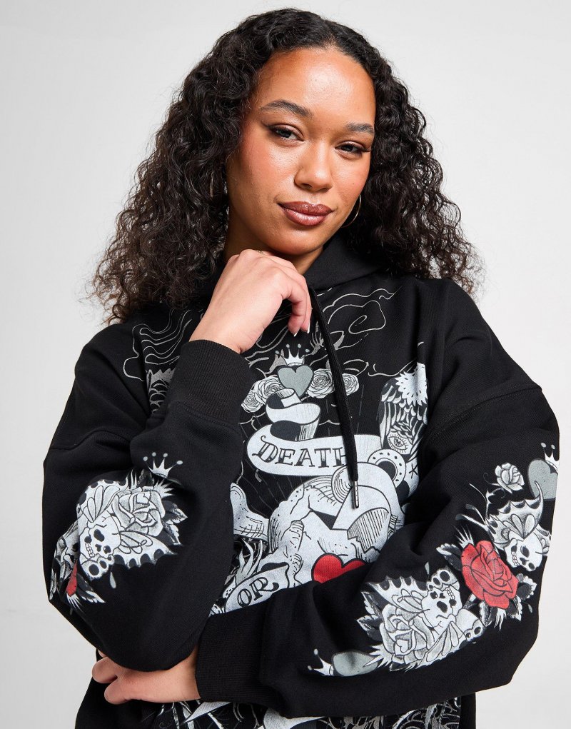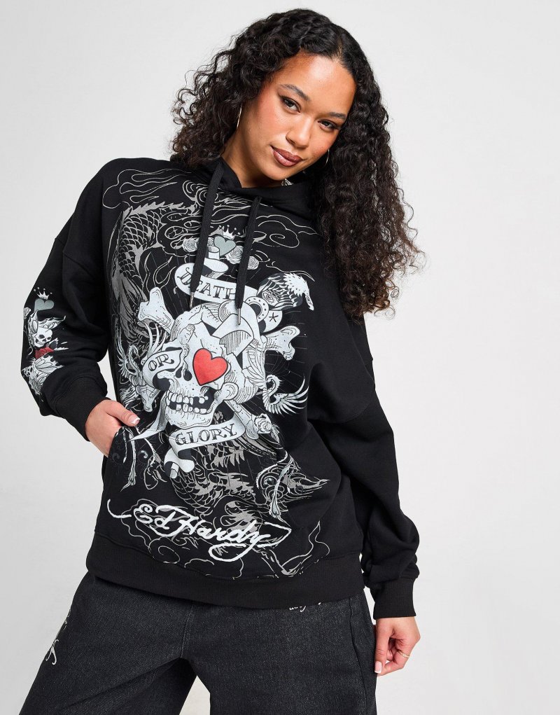 Bring den Y2K-Style in deinen Look mit dem Ed Hardy Dagger Boyfriend Hoodie für Damen. Dieser Relaxed-Fit Hoodie in Schwarz besteht aus weichem, dickem Fleece und bietet absoluten Tragekomfort. Er verfügt über eine verstellbare Kapuze für kuscheligen Schutz und dehnbare, gerippte Bündchen an Ärmeln und Saum, um die Passform zu optimieren. Außerdem bietet die geräumige Kängurutasche auf der Vorderseite Platz für eine einfache Aufbewahrung, während ein auffälliges Motiv von Ed Hardy an der Vorderseite platziert ist. Waschmaschinengeeignet. Unser Model ist 1,70 m groß und trägt Größe S.