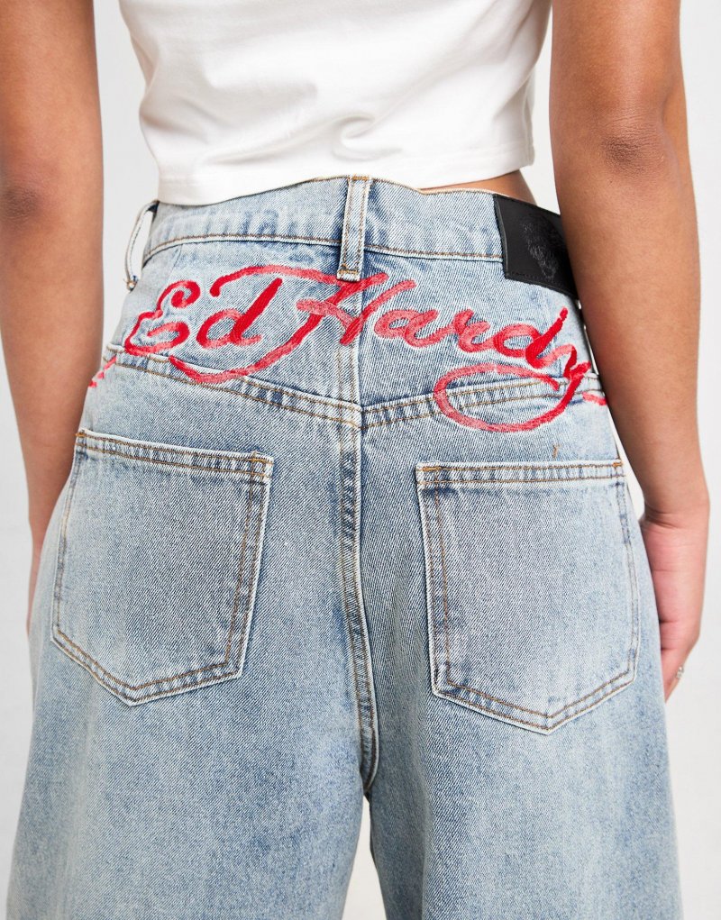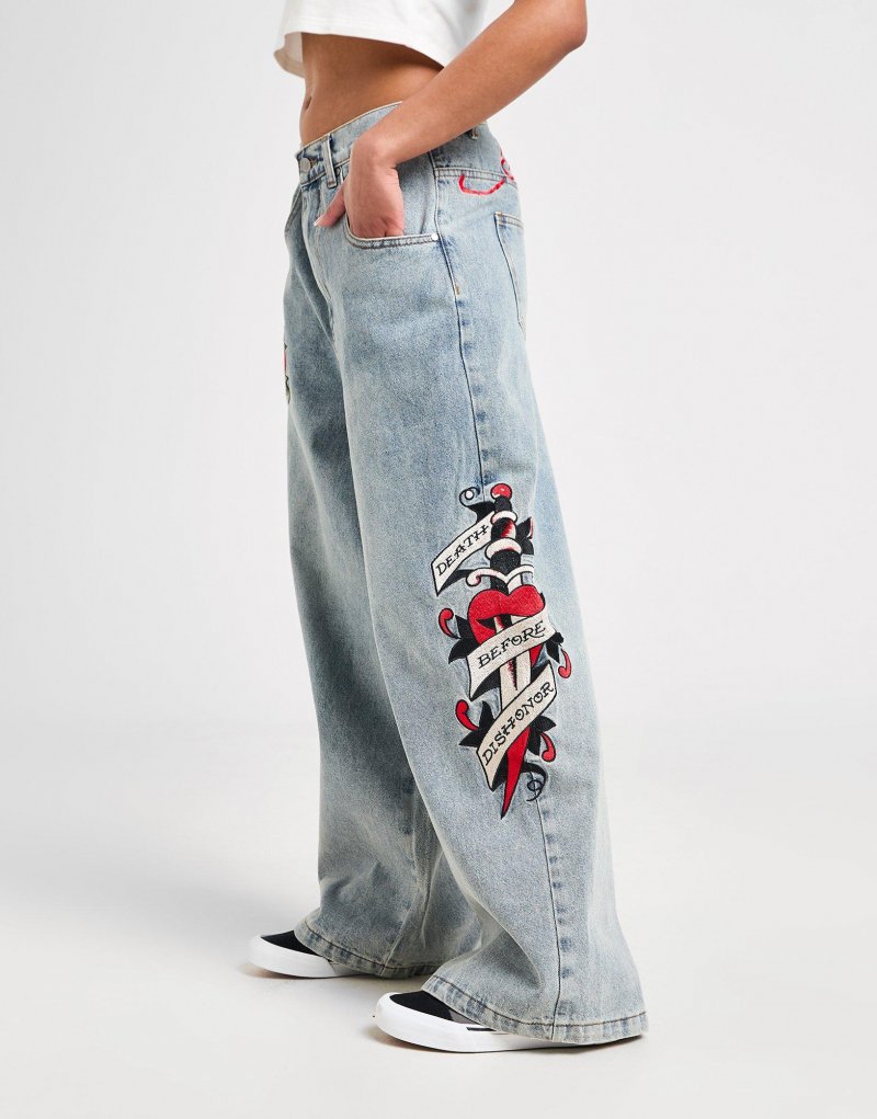 Mit der Ed Hardy Dagger Wide Jeans für Damen bringst du Statement-Style in deine Garderobe. Diese Mid-Rise Jeans ist in der Farbe Blue Wash gehalten und besteht aus hochwertigem Denim-Stoff, um dir erstklassigen Komfort zu bieten. Sie verfügt über einen klassischen Hosenschlitz mit Knopfverschluss, sichtbare Nähte und tiefe Taschen. Diese Loose-Fit Hose mit weitem Hosnebein ist mit dem klassischen Logo von Ed Hardy und einem auffälligen Dolchmotiv auf dem linken Hosenbein versehen. Waschmaschinengeeignet. Unser Model trägt Größe S.
