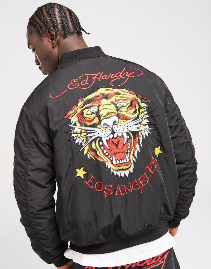 Bringen Sie mit dieser Herren-Bomberjacke „LA Tiger“ von Ed Hardy straßentaugliche Energie in Ihre Garderobe. Die Jacke in Schwarz mit kastiger Passform besteht aus glattem Polyestergewebe für dauerhaften Tragekomfort. Sie verfügt über einen Baseballkragen und einen durchgehenden Reißverschluss zur individuellen Anpassung der Passform, gerippte Abschlüsse für einen formstabilen Sitz und Seitentaschen für Stauraum. Ed Hardys Unterschrift auf den Ärmeln, ein Tiger-Print und der Schriftzug „Los Angeles“ auf der Rückseite runden das Design ab. Maschinenwaschbar. | Unser Model ist 1,85 m groß, hat einen Brustumfang von 91 cm und trägt Größe M.