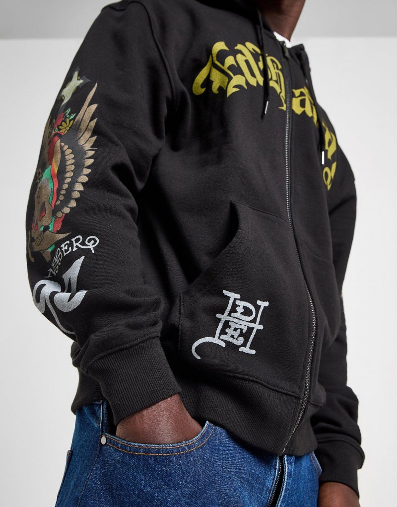 Verleihen Sie Ihrem straßentauglichen Outfit mit diesem Skull Bike Hoodie für Herren von Ed Hardy eine coole Note. Der locker geschnittene Hoodie in Schwarz besteht aus weichem, dickem Baumwoll-Mischfleece für langanhaltenden Tragekomfort. Er verfügt über einen durchgehenden Reißverschluss mit verstellbarem Kordelzug in der Kapuze für zusätzlichen Schutz. Elastische Rippbündchen sorgen für einen sicheren Sitz, eine geteilte Kängurutasche vorne bietet Stauraum. Prägnante Ed Hardy-Grafiken runden das Design ab. Maschinenwaschbar. | Unser Model ist 1,85 m groß, hat einen Brustumfang von 91 cm und trägt Größe M.