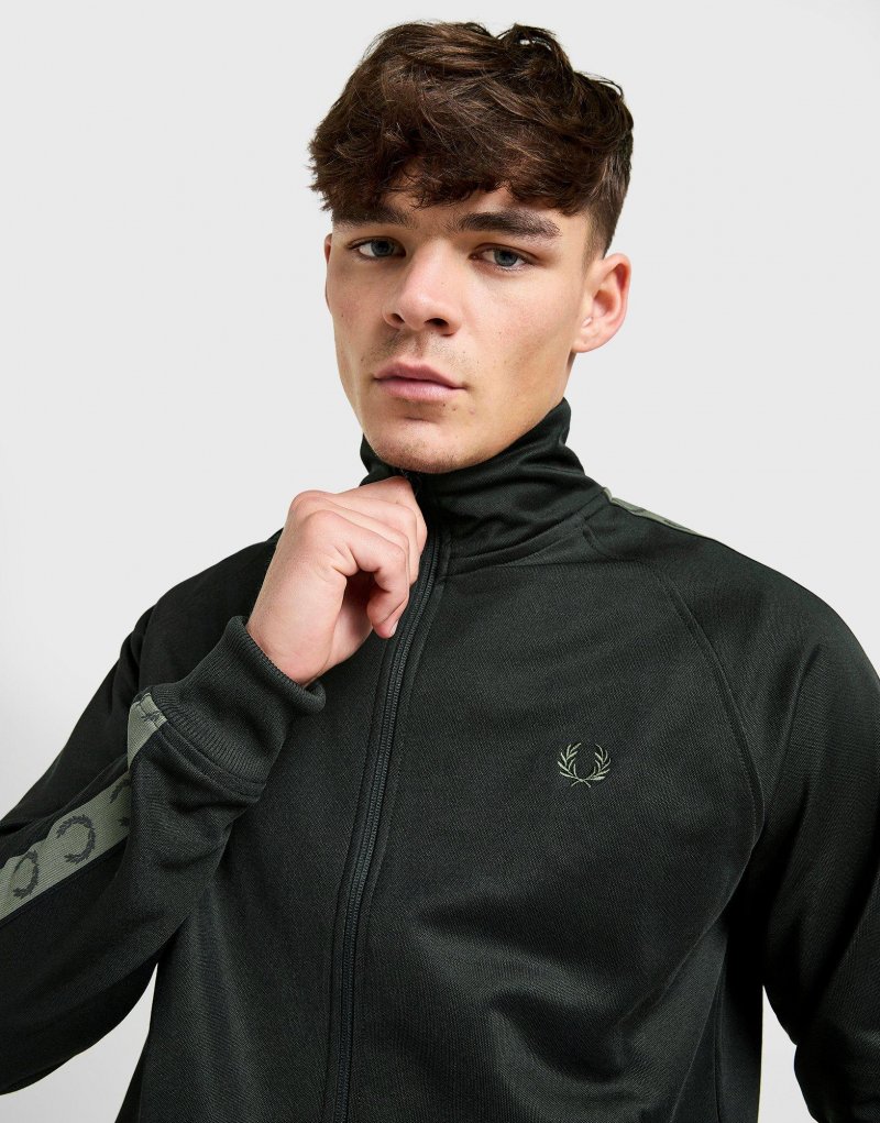 Sichere dir ein Style-Upgrade mit dem Fred Perry Taped Trainingsoberteil für Herren. Dieses JD-exklusive Oberteil in Dunkelgrün ist aus glattem, teilweise recyceltem Trikotstoff gefertigt, um erstklassigen Komfort zu gewährleisten. Außerdem verfügt es über einen durchgehenden Reißverschluss und einen Stehkragen für einen individuellen Look, während gerippte Bündchen die Passform stabilisieren. Die Seitentaschen dienen zur Aufbewahrung und die Logo-Tapes an den Ärmeln sorgen für einen auffälligen Look. Abgerundet wird das Design durch das Lorbeerkranz-Logo auf der Brust. Waschmaschinengeeignet. Unser Model ist 1,88 m groß, hat einen Brustumfang von 94 cm und trägt Größe M.