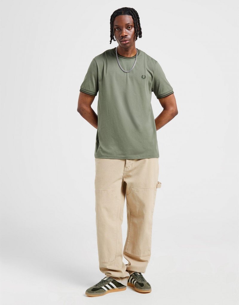 Zeit für einen neuen Alltags-Look mit dem Fred Perry Twin Tiped Ringer T-Shirt für Herren. Dieses Standard-Fit Oberteil in Grün besteht aus weicher, leichter Baumwolle und bietet maximalen Tragekomfort. Es verfügt über einen Rundhalsausschnitt und kurze Ärmel mit gerippte Bündchen für einen klassischen Look. Abgerundet wird das Design durch die kontrastierenden Doppelspitzen an Kragen und Ärmeln, während der ikonische Lorbeerkranz von Fred Perry auf der Brust platziert ist. Waschmaschinengeeignet. Unser Model ist 1,83 m groß, hat einen Brustumfang von 89 cm und trägt Größe M.