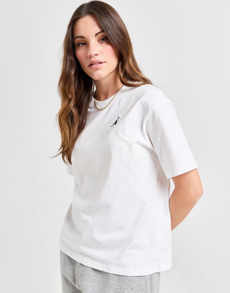 Erfrischen Sie Ihre Essentials mit diesem Essential T-Shirt für Damen von Jordan. Dieses T-Shirt in Standard-Passform in Weiß ist aus weichem Baumwollstoff gefertigt und bietet Komfort für jeden Tag. Es hat kurze Ärmel mit geripptem Rundhalsausschnitt und ist mit einem Jumpman auf der Brust versehen. Maschinenwaschbar | Unser Model ist 1,75 m groß und trägt Größe S.