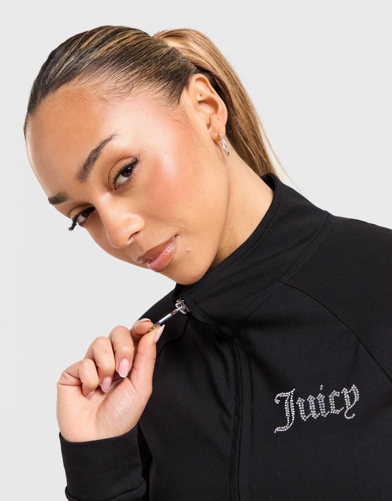 Verleihen Sie Ihrem Athleisure-Look mit diesem Diamante Fit Full Zip Top für Damen von Juicy Couture einen Hauch von Glanz. Dieses JD-exklusive Top in Schwarz hat einen leicht verkürzten Saum, Raglanärmel und einen durchgehenden Reißverschluss mit Stehkragen für individuelle Bedeckung. Es besteht aus glattem und dehnbarem Strickstoff für figurbetonten Tragekomfort. Abgerundet durch das funkelnde Juicy-Branding mit Strasssteinen auf der Brust. Maschinenwaschbar. | Unser Model ist 1,73 m groß und trägt Größe S.