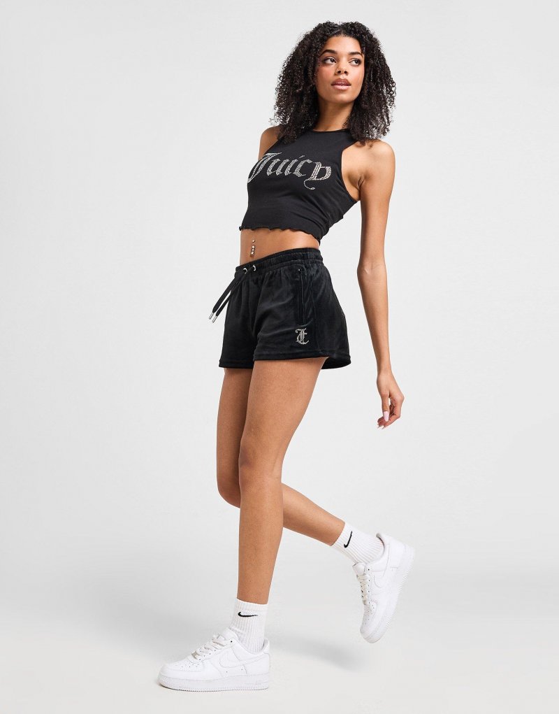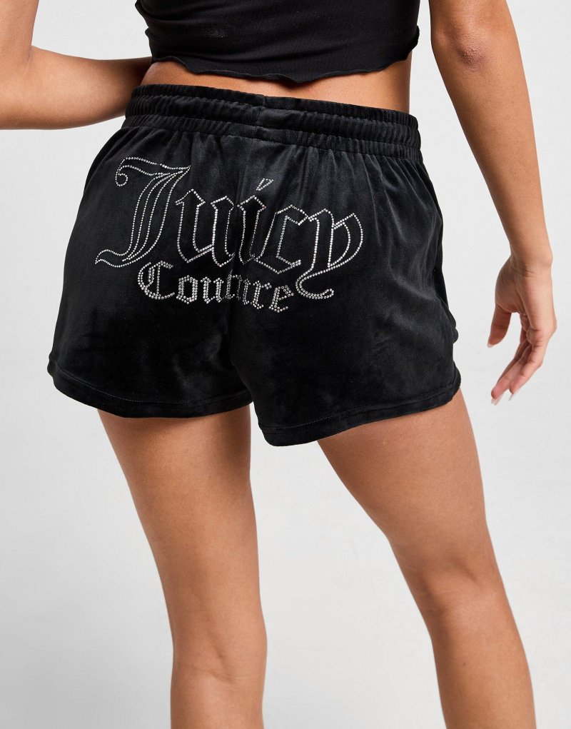 Verleihen Sie Ihrem Freizeitlook mit diesen Diamante JC Logo Shorts für Damen von Juicy Couture einen Hauch von Glanz. Diese schwarzen JD-exklusiven Shorts sind aus Veloursstoff im Stil der 2000er Jahre gefertigt. Sie haben einen dehnbaren Gummibund mit Kordelzug und Taschen für alles Wichtige. Abgerundet durch das charakteristische Juicy-Branding mit Diamanten auf der Rückseite und das JC-Monogramm auf der Vorderseite. Maschinenwaschbar. | Unser Model ist 1,73 m groß und trägt Größe S.