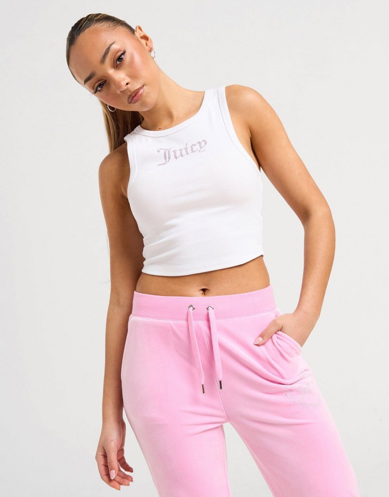 Exklusiv bei JD. Verleihen Sie Ihren Basics einen Hauch von Glamour mit diesem Diamante Rib Tank Top für Damen von Juicy Couture. Dieses schmal geschnittene Top in Weiß hat dicke Einfassungen am Halsausschnitt und an den Armausschnitten für Strapazierfähigkeit, während der kurze Saum Sie kühl hält. Es ist aus weicher und dehnbarer gerippter Baumwolle gefertigt und mit einem Juicy-Branding mit Strasssteinen auf der Brust versehen. Maschinenwaschbar. | Unser Model ist 1,73 m groß und trägt Größe S.