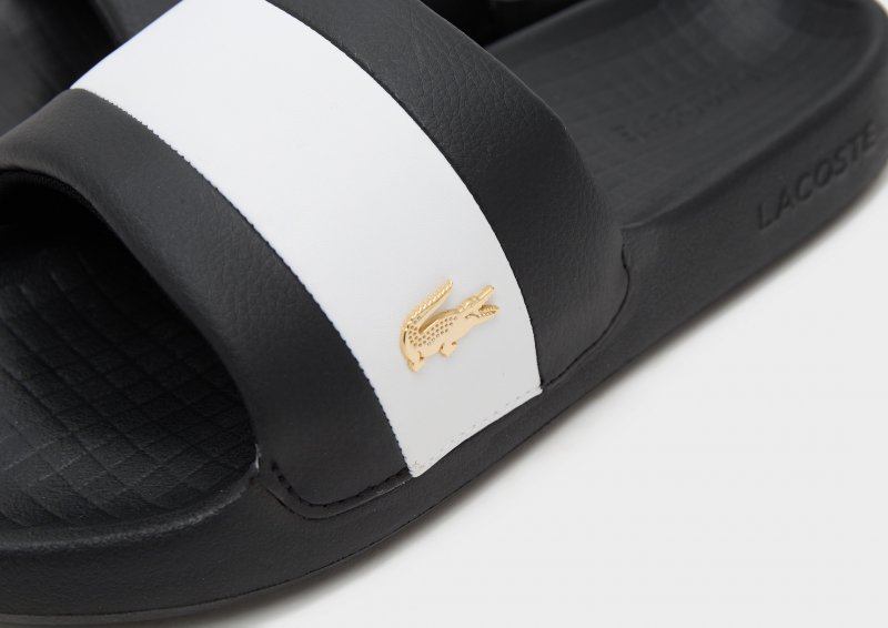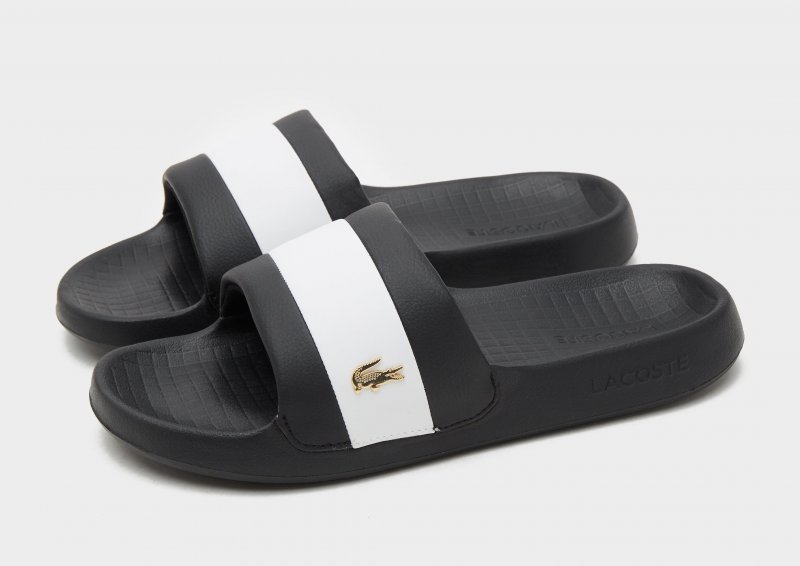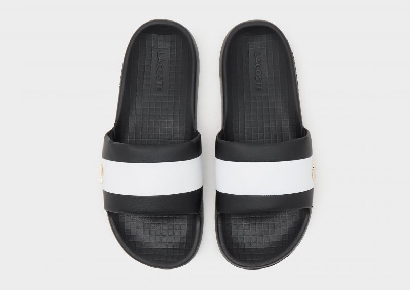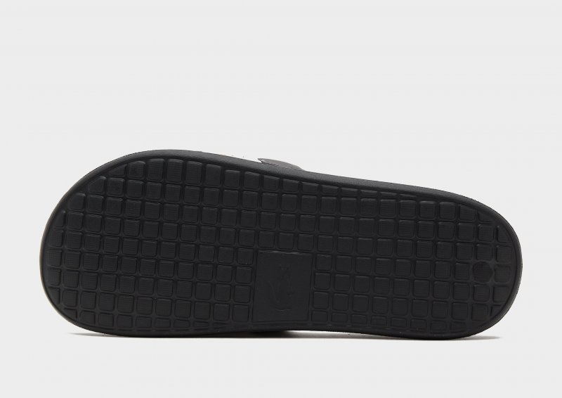 Zeit für neue Chillout-Looks mit den Serve Pin Herren-Slippern von Lacoste. Diese Pantoletten sind in Schwarz gehalten und besitzen ein weiches Schaumstoff-Fußbett für absoluten Tragekomfort. Ein breiter, leichter Riemen bietet sicheren Halt, während die robuste Gummi-Außensohle für griffige Traktion sorgt. Abgerundet wird das Design durch das klassische Lacoste-Logo und ein metallisches Krokodil.