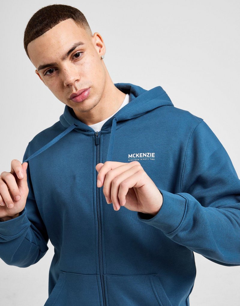 Frischen Sie Ihre Freizeitkleidung mit diesem Essential Full Zip Hoodie für Herren von McKenzie auf. Dieser Hoodie mit Standard-Passform in der Farbe Blau besteht aus weichem Baumwoll- und recyceltem Polyfleece für dauerhaften Tragekomfort. Er verfügt über einen durchgehenden Reißverschluss mit verstellbarem Kordelzug durch die Kapuze, um den Schutz zu erhöhen, und dehnbare Rippbündchen für einen sicheren Sitz. Er verfügt über eine geteilte Kängurutasche vorne zur Aufbewahrung und ist mit dem charakteristischen McKenzie-Branding auf der Brust versehen. Maschinenwaschbar. | Unser Model ist 1,85 m groß, hat einen Brustumfang von 96,5 cm und trägt Größe M.