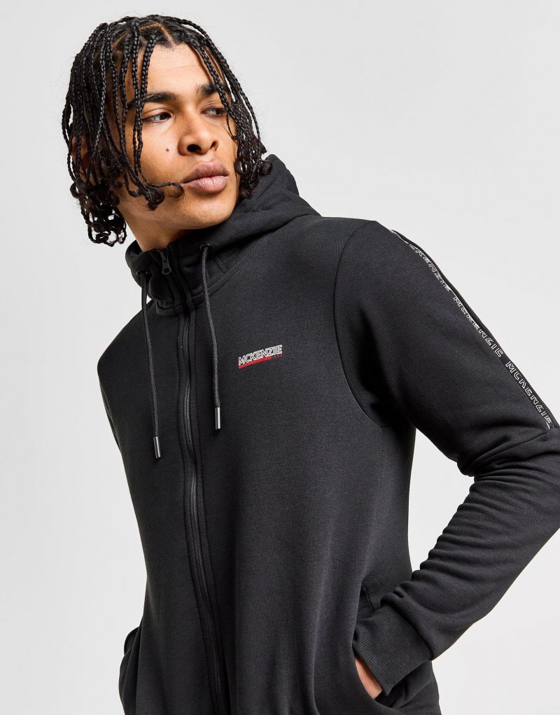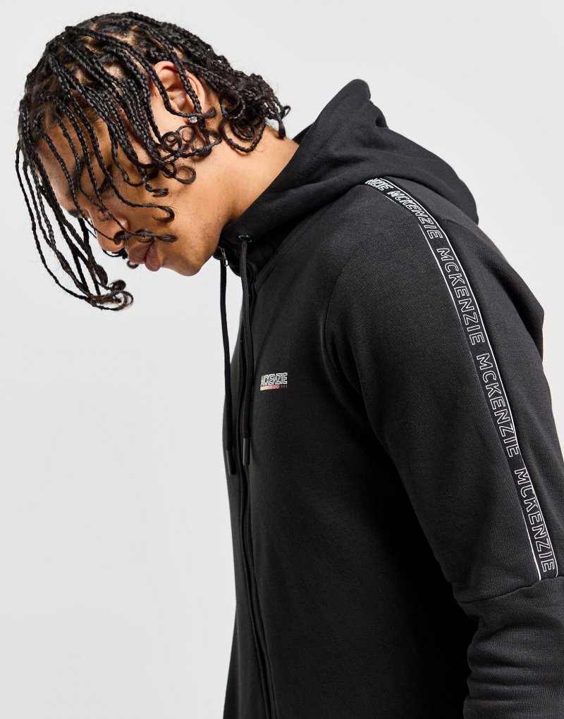 Mit dem McKenzie Essential Tape Hoodie für Herren bringst du frischen Wind in deinen Freizeit-Look. Dieser Regular-Fit Hoodie in Schwarz besteht aus einem weichen Baumwoll-Fleece-Mix und bietet dauerhaften Komfort. Er hat einen durchgehenden Reißverschluss, einen hochgeschnittenen Kragen und einen verstellbaren Kordelzug an der Kapuze, um den Schutz zu erhöhen. Die dehnbaren, gerippten Bündchen sorgen für einen sicheren Halt, während zwei Taschen auf der Vorderseite die Aufbewahrung erleichtern. Die Ärmel sind mit einem sportlichen Markenband ausgestattet, während das klassische Logo von McKenzie auf der Brust platziert ist. Waschmaschinengeeignet. Unser Model ist 1,88 m groß, hat einen Brustumfang von 94 cm und trägt Größe M.