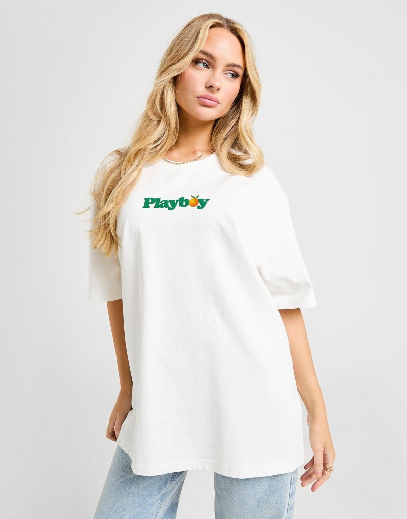 Tanken Sie Vitamin C mit diesem orangefarbenen Boyfriend-T-Shirt für Damen von Playboy. Das locker geschnittene T-Shirt in Off-White ist aus weicher, leichter Baumwolle gefertigt und bietet so Tragekomfort für jeden Tag. Der klassische gerippte Rundhalsausschnitt und die kurzen Ärmel mit überschnittenen Schultern sorgen für einen lässigen Look. Abgerundet wird das T-Shirt durch eine Playboy-Grafik auf dem Rücken und ein charakteristisches Logo auf der Brust. Maschinenwaschbar. | Unser Model ist 1,70 m groß und trägt Größe S.
