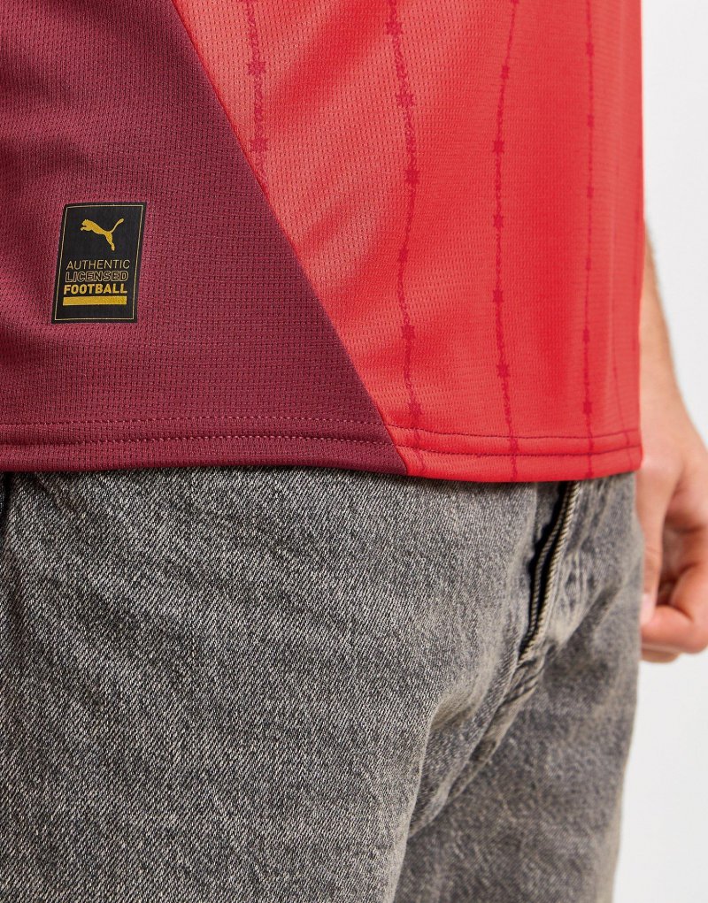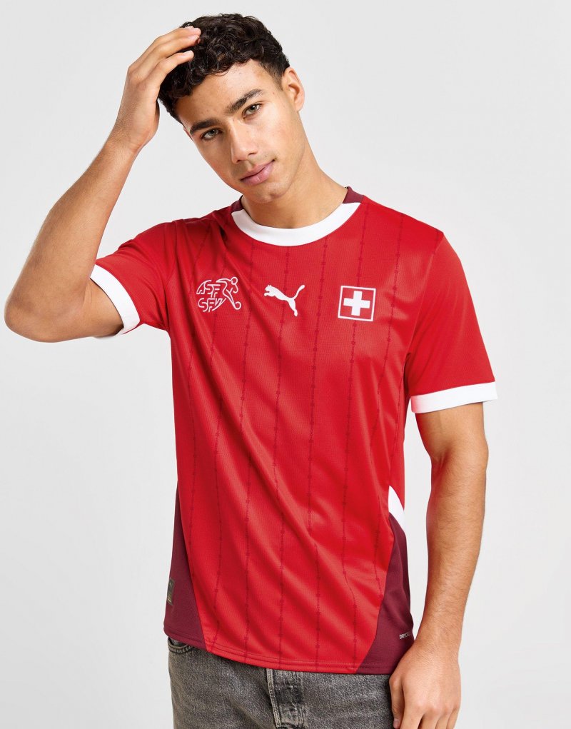 Unterstützen Sie Ihr Land mit diesem Schweiz 2024-Heimtrikot für Herren von PUMA. Dieses Trikot in Standard-Passform in Rot mit weißem Besatz ist aus leichtem, atmungsaktivem Polyestergewebe für kühlen Tragekomfort gefertigt. Es hat kurze Ärmel mit geripptem Rundhalsausschnitt und ist mit dryCELL-Schweißableitung ausgestattet, damit Sie trocken und frisch bleiben. Abgerundet mit dem PUMA-Logo und dem Schweiz-Wappen auf der Brust. Maschinenwaschbar. | Unser Model ist 1,83 m groß, hat einen Brustumfang von 96,5 cm und trägt Größe M.