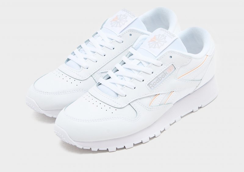 Schnüren Sie sich in eine Old-School-Ikone mit diesen Classic Leather-Turnschuhen für Junioren von Reebok. In einer weißen Farbgebung mit pfirsichfarbenen Akzenten haben diese JD-exklusiven Kicks ein Obermaterial aus glattem Leder mit genähten Überzügen für langanhaltenden Tragekomfort. Sie haben einen Schnürverschluss mit weicher Polsterung um den Knöchel, um Sie festzuhalten, und sitzen über einer dicken Schaumstoff-Zwischensohle für unverzichtbaren Komfort. Mit einem robusten Gummiprofil für guten Halt sind sie mit dem charakteristischen Reebok-Branding versehen.