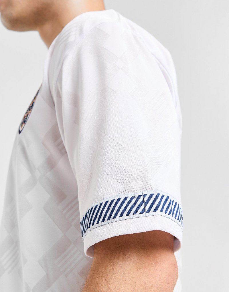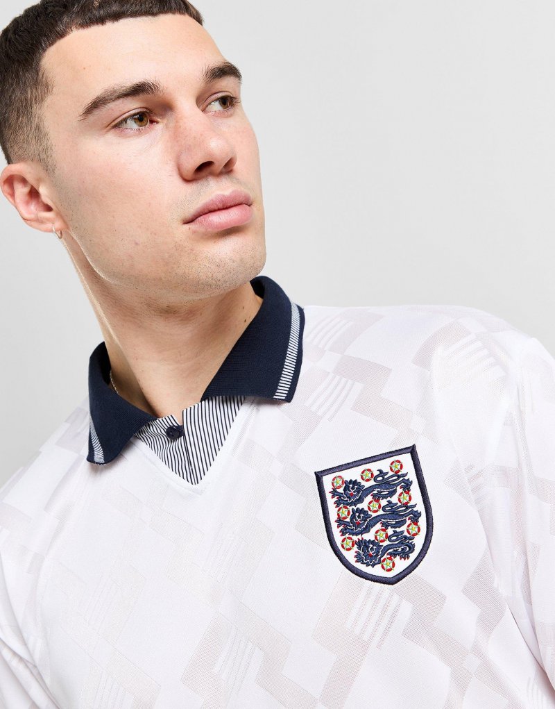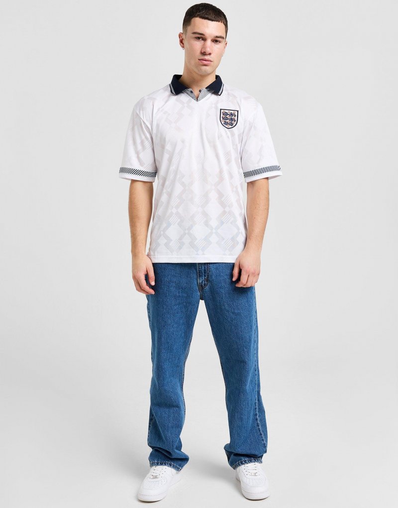 Aus den Archiven zurückgeholt, dieses Herren England '90 World Cup Heimat Shirt von Score Draw ist eine Replik des T-Shirts das die Mannschaft während der 1990 World Cup Finals trug. In einer frischen weißen Farbe, bietet das leichte Jersey einen kontrastierenden Kragen, Single-Button-Befestigung und kurze Ärmel mit gestreiften Trimmen. Das Retro-Shirt ist mit dem kultigen England Logo auf die Brust bestickt. | Unser Modell ist 1m 88cm hoch und trägt eine Größe Medium.