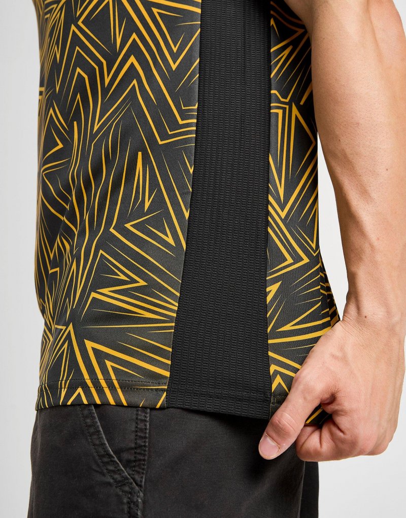 Mit dem Wolverhampton Wanderers Pre-Match Herren-T-Shirt von SUDU bringst du deinen Fan-Look auf ein neues Level. Dieses schwarze Oberteil ist mit einem auffälligen gelben Print auf der Vorder- und Rückseite versehen und verfügt über einen Rundhalsausschnitt, Raglanärmel sowie dehnbare Mesh-Paneele an den Seiten. Es besteht aus glattem Polyester und ist mit dem SUDU-Logo sowie dem Wappen der Wolves versehen. Waschmaschinengeeignet. Unser Model ist 1,83 m groß, hat einen Brustumfang von 99 cm und trägt Größe M.