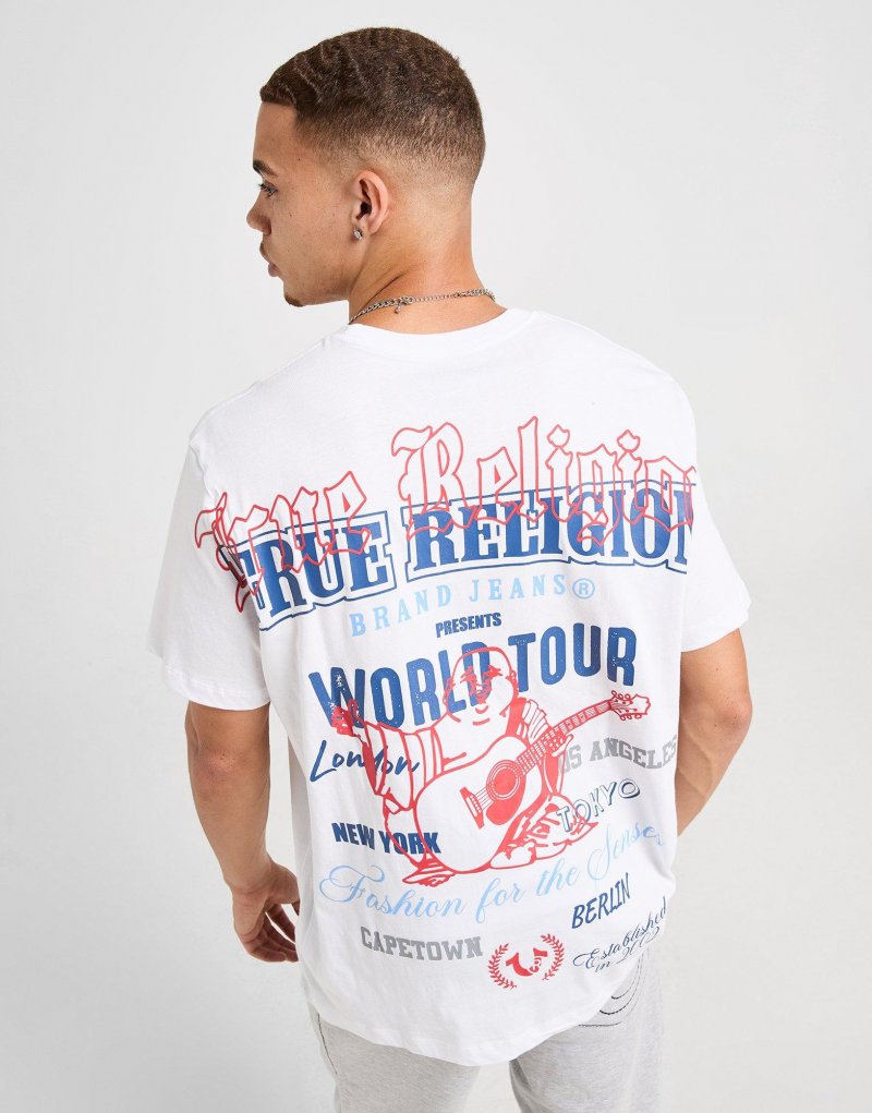 Bringen Sie mit diesem Herren-T-Shirt mit Multi-Logo-Rücken von True Religion einen lässigen Streetstyle in Ihre Garderobe. Das locker geschnittene T-Shirt in Weiß ist aus weicher Baumwolle gefertigt und sorgt für langanhaltenden Tragekomfort. Der gerippte Rundhalsausschnitt und die kurzen Ärmel sorgen für ein bequemes Tragegefühl, während die leicht überschnittenen Schultern für einen entspannten Tragekomfort sorgen. Das True Religion-Logo auf der Brust und ein „Word Tour“-Grafikdruck auf dem Rücken runden das Design ab. Maschinenwaschbar. | Unser Model ist 1,83 m groß, hat einen Brustumfang von 96 cm und trägt Größe M.