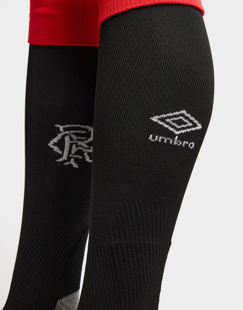 Repräsentiere dein Team auf dem Spielfeld mit diesen Rangers FC 2025/26 Heimsocken von Umbro. In Schwarz mit roten Details sind diese knielangen Socken aus weichem, elastischem Material gefertigt, das teilweise recycelt wurde und so für dauerhaften Tragekomfort sorgt. Die gepolsterte Ferse und das Fußbett sorgen für zusätzlichen Halt und sind mit dem Umbro-Logo und dem Rangers-Wappen versehen. Maschinenwaschbar.