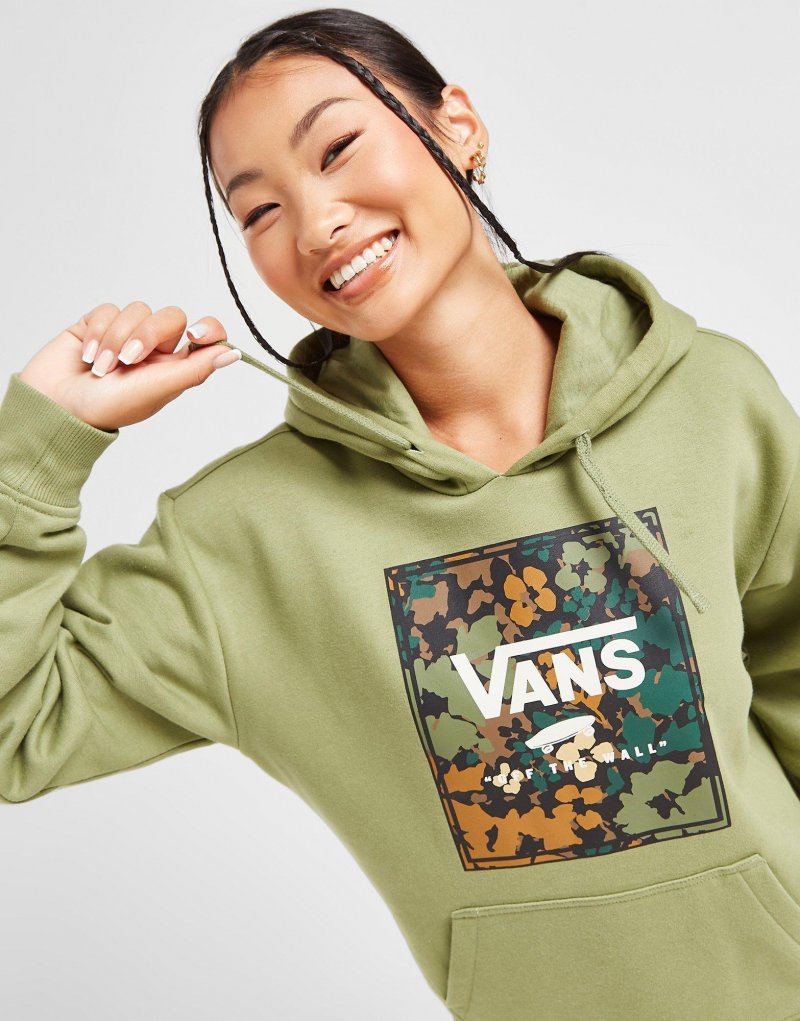 Tragen Sie einen frischen Look von Vans mit diesem Damen-Hoodie mit Grafikdruck. Dieser Kapuzenpullover mit entspannter Passform ist in der Farbe Grün gehalten und besteht aus weichem und kuscheligem Fleecestoff. Es hat ein Overhead-Design und verfügt über eine verstellbare Kapuze, lange Ärmel und gerippte Abschlüsse, die die Passform optimieren. Dieser Kapuzenpullover verfügt über eine zentrale Kängurutasche, eine Box-Grafik auf der Brust und das charakteristische Vans-Branding. Waschmaschinenfest. | Unser Model ist 1,75 Meter groß und trägt die Größe S.