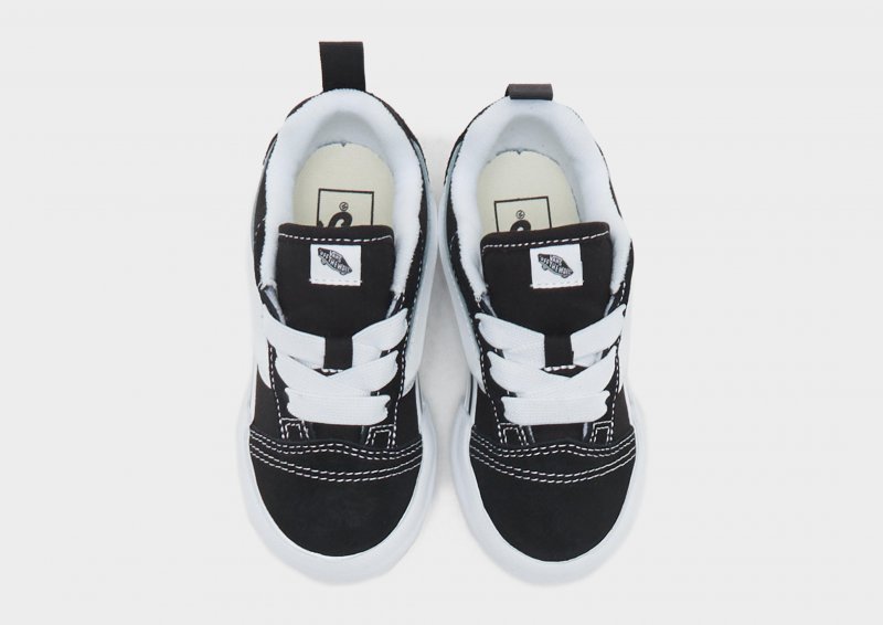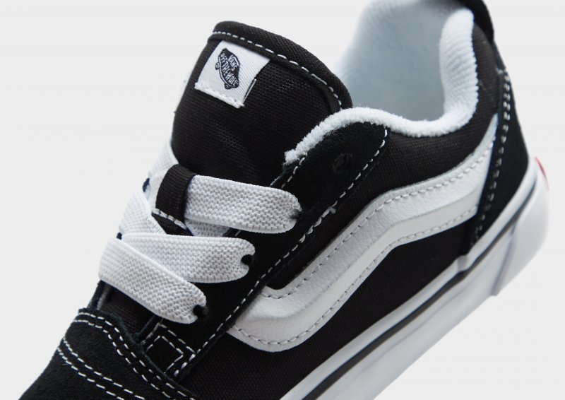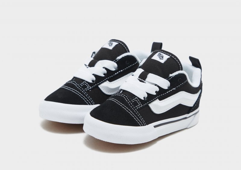 Bring einen Skate-inspirierten Stil in den Look deiner Kids mit diesen Knu Skool Baby-Sneakern von Vans. Diese Sneaker sind in den Farben Schwarz und Weiß gehalten und haben ein strapazierfähiges Canvas-Obermaterial mit weichen Wildleder-Overlays. Sie verfügen über elastische Schnürsenkel und eine gewebte Zugschlaufe für einfaches Tragen und eine dicke, schwammartige Polsterung um den Knöchelkragen für ein angenehmes Tragegefühl. Zudem bieten sie eine leichte Dämpfung unter den Füßen und eine robuste Gummi-Außensohle für griffige Traktion. Abgerundet wird das Design durch einen übergroßen Sidestripe und das klassische Logo von Vans.