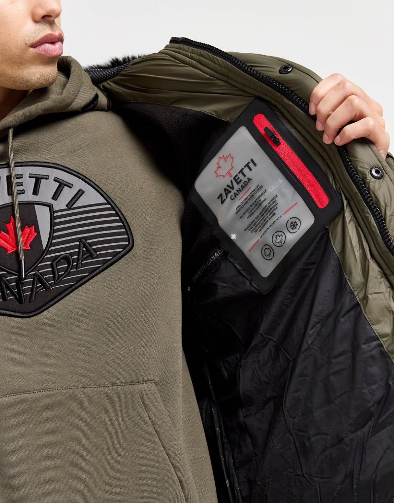 Mit der Eremo Puffer Parka Herrenjacke von Zavetti Canada spielt das Wetter keine Rolle mehr. Diese Jacke ist in der Farbe Kahaki gehalten und besteht aus wattiertem und gestepptem Polyester mit synthetischer Daunenfüllung, um die Kälte abzuhalten. Die lange Jacke verfügt über einen durchgehenden Reißverschluss, zusätzliche Druckknöpfe und eine Kapuze für mehr Schutz. Sie hat mehrere Taschen an der Vorderseite, die PLatz für deine Sachen bieten. Das typische Maple Leaf auf dem linken Ärmel verleiht dem Design einen runden Abschluss. Waschmaschinengeeignet. Unser Model ist 1,80 m groß, hat einen Brustumfang von 97 cm und trägt Größe M.
